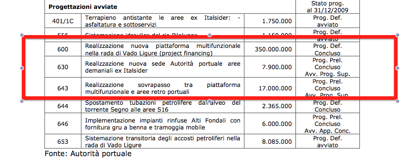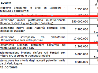 Parlando in vecchie Lire, tra i 34 miliardi per la realizzazione del sovrappasso della non piattaforma e i 700 miliardi per la non piattaforma stessa, sempre tra le "Progettazioni AVVIATE" troviamo i 15 miliardi abbondanti per la realizzazione dell'indispensabile NUOVA SEDE PORTUALE, quella (orrenda) progettata dagli amici di 5+1AA per capirci: €7.900.000