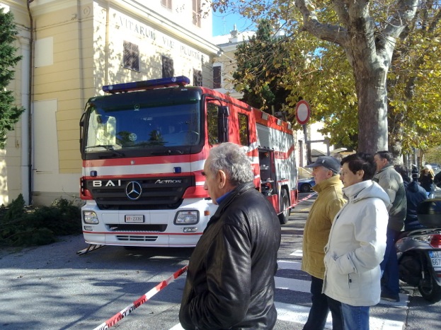 Tragedia sfiorata oggi davanti al cimitero di Zinola, a Savona, dove un grosso cipresso si e' abbattuto su tre auto, due Fiat Panda rossa e una Matiz, parcheggiate all'ingresso del camposanto.