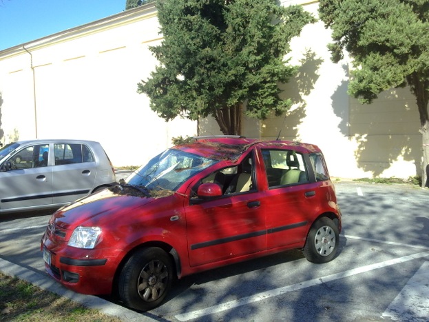Anziana lievemente contusa, albero forse con radici marce. La macchina ha attutito la caduta dell'albero e salvato la donna (Le foto di un nostro affezionato Lettore)