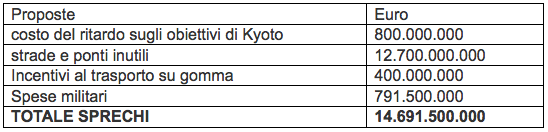 Oltre 14 miliardi eliminando costi di infrastrutture inutili, emergenza, ritardi su Kyoto, spese militari, agevolazioni all'autotrasporto e combattendo illegalità e evasione