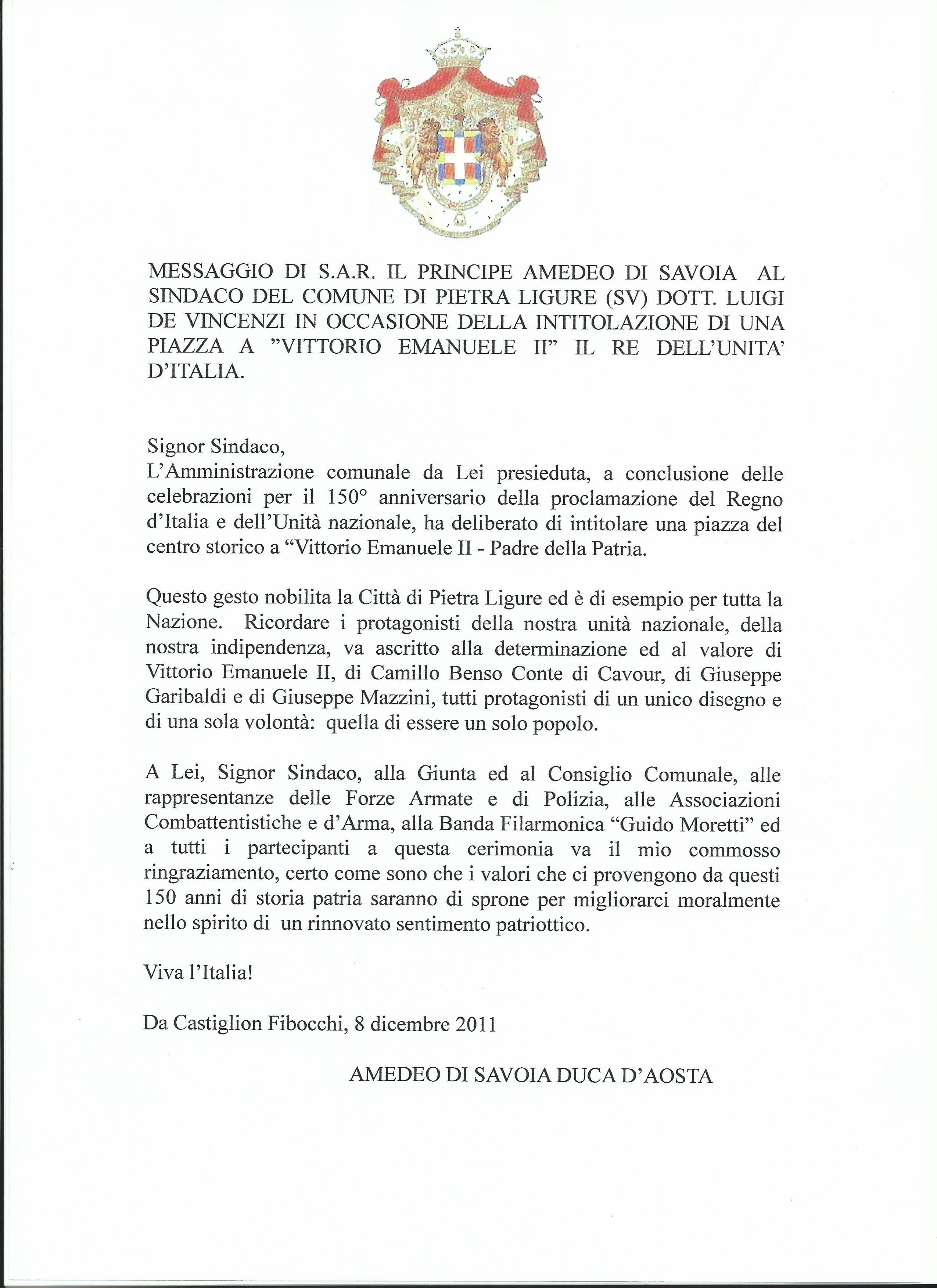L’Istituto Nazionale per la Guardia d’Onore alle Reali Tombe del Pantheon, Delegazione Provinciale di Savona, partecipato alla cerimonia di inaugurazione di una piazza intitolata a Vittorio Emanuele II, Padre della Patria e “Re Galantuomo” che si è svolta giovedì 8 dicembre a Pietra Ligure alla presenza delle Autorità civili e militari della provincia e dell’Ispettore Nazionale della Guardie d’Onore il Conte Prof. Stefano Emanuele Monti Bragadin, illustre cittadino della città rivierasca.