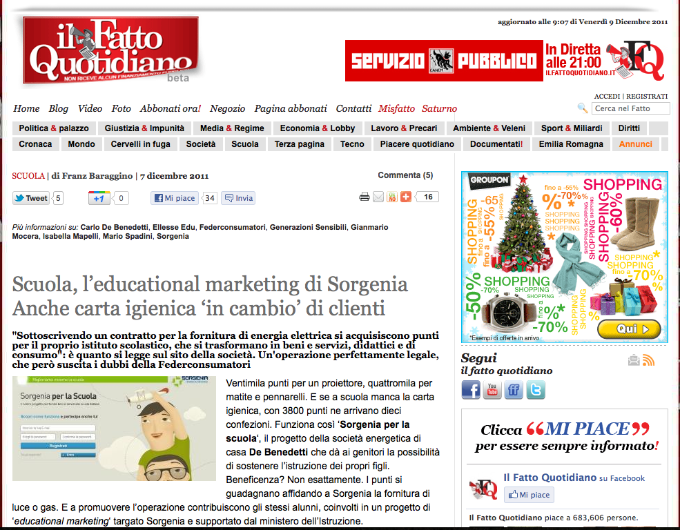 La realizzazione del progetto di ‘educational marketing’ che trasforma i ragazzi in “reporter ambientali” è affidato alla società Ellesse Edu, che nel suo sito internet pubblica anche un codice deontologico. “Esclusa qualunque azione che possa essere ricondotta a meri interessi commerciali”, assicurano. Ma gli studenti ricevono anche le cartoline che promuovono l’offerta ‘Sorgenia per la scuola’ per i nuovi clienti. “L’offerta è ricordata anche in fondo al fascicoletto consegnato agli alunni”, racconta Isabella Mapelli, che il 24 novembre ha accompagnato una classe della scuola media Buzzati di Milano all’evento di presentazione organizzato da Sorgenia. “Un progetto fatto con discrezione”, sostiene l’insegnante, che assicura: “Ormai nelle scuole riceviamo proposte decisamente più sfacciate”. Del resto, fa notare un articolo di Repubblica, il quotidiano che in comune con Sorgenia ha i proprietari, l’idea rivolta alle scuole è piaciuta anche al ministero dell’Istruzione, che ha dato il suo “supporto”.
