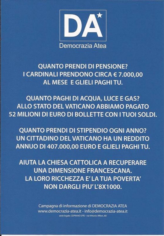 Parte anche a Savona la campagna d’informazione di Democrazia Atea il cui scopo è quello di far conoscere nel concreto i privilegi, pagati da noi, che il Vaticano ha conquistato in anni di malgoverno e corruzione. Crediamo che sia giusto denunciare, soprattutto in questo clima di crisi che continua a penalizzare solo le fasce più deboli e che non costruisce alcun futuro per i nostri figli, le possibilità di sviluppo che il nostro paese può avere nel concreto evitando di gettare in fumo milioni di Euro che invece finiscono nelle tasche dello stato più piccolo, più ricco e più potente al mondo. Una realtà che costa agli italiani ben 6 miliardi di € ogni anno, tolti alla sanità, alle scuole laiche, alle infrastrutture, a chi realmente ha bisogno e ha pagato tasse per tutta una vita.