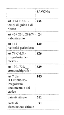2. Inoltre, nel corso di un' anno di attività, numerosissimi sono stati i controlli effettuati e le violazioni contestate, che, complessivamente in ambito regionale sono state nr. 136.871 (4154 i documenti di guida ritirati) di cui nr. 35.466 nella provincia di Savona (912 i documenti di guida ritirati).