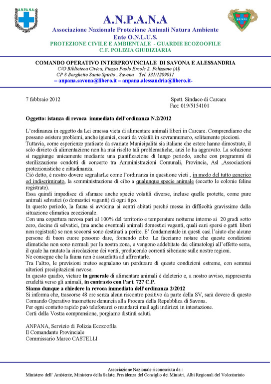 Relativamente all'ordinanza emessa dal Sindaco di Carcare che vieta di sfamare qualunque animale libero, indistintamente, nel Comune, rimarchiamo la crudeltà della medesima, e la non opportunità di applicarla, soprattutto in un periodo di gravissima difficoltà della fauna selvatica causa emergenza meteo.