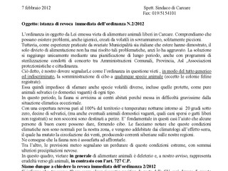Relativamente all'ordinanza emessa dal Sindaco di Carcare che vieta di sfamare qualunque animale libero, indistintamente, nel Comune, rimarchiamo la crudeltà della medesima, e la non opportunità di applicarla, soprattutto in un periodo di gravissima difficoltà della fauna selvatica causa emergenza meteo.