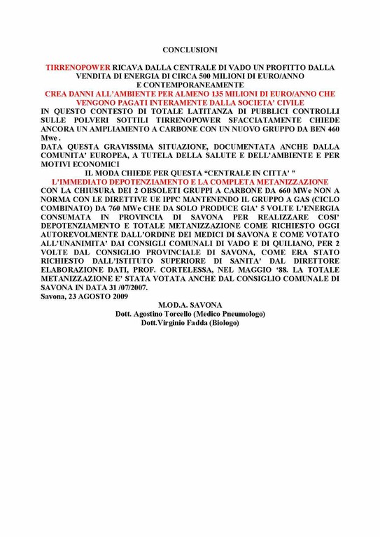 Ribadiamo quindi ancora quanto già da anni richiesto urgentemente dalla commissione scientifica di spotorno e più di recente dall’ordine dei medici della provincia di savona nonchè da molte associazioni e comitati del territorio depotenziamento e completa metanizzazione questa centrale in città".