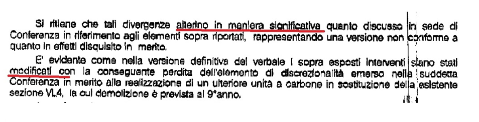 che i sindaci di Vado e Quiliano hanno fatto dichiarazioni clamorose su quanto scritto nel verbale definitivo: "Si ritiene che tali divergenze alterino in maniera significativa quanto discusso in sede di Conferenza in riferimento agli elementi sopra riportati, rappresentando una versione non conforme a quanto effettivamente disquisito in merito ..." e ancora "è evidente come nella versione definitiva del verbale i sopra esposti interventi siano stati modificati...". Dichiarazioni che fino ad ora non ci risultano mai smentite o confutate da alcuno.