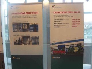 Attualmente vengono utilizzati detergenti universali (Oasis) con nano-particelle e sono stati introdotti prodotti più specifici per superfici lavabili, metalliche e vetrate che agiscono sulla struttura molecolare ripristinandone l’aspetto originario. Per i vetri esterni dei locomotori e della cabine di guida è utilizzato il “P100 protector” le cui caratteristiche “nanotecnologiche” sono già ampiamente utilizzate in campo automobilistico e nautico. Per la pulizia dei pavimenti è stata inserita la tecnica denominata “spray cleaning”: un processo di indurimento delle cere ad alta reticolazione, che prolunga la durata della ceratura rendendo la superficie più lucida e protettiva, rispettandone le caratteristiche antiscivolo. Per le superfici denominate “difficili” (braccioli e poggiatesta in neoprene, pareti ad alta porosità e superfici di maggior contatto come i sedili) è stato selezionato un prodotto altamente tecnologico della “Linea Nautica” appositamente studiato per la pulizia, la manutenzione e la protezione di supporti di prestigio. Un prodotto “forte ma gentile”, in grado di riportare le superfici trattate alla loro brillantezza originale.