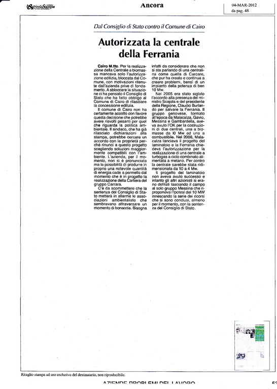 Ma le brutte notizie non finiscono qui: ecco nei giorni scorsi essere riesumato il vecchio progetto della proprietà di Ferrania circa la costruzione di una megacentrale a biomasse in quell'area (vedi articolo), di ben 10 Mw di porenza elettrica; un'enormità di produzione energetica, se si pensa che, ad esempio, Calizzano prevede la costruzione di una centrale a biomasse di "soli" 3 MW, il cui funzionamento non potrà andare avanti più di qualche anno utilizzando solo la biomassa lignea della zona, prevedendo quindi in seguito prima l'uso di legna proveniente da siti sempre più distanti, financo dall'estero (sull'esempio di altre realtà italiane), poi, probabilmente, anche la combustione di rifiuti solidi, per far si che la proprietà consegua qualche vantaggio economico dalla sua azienda.