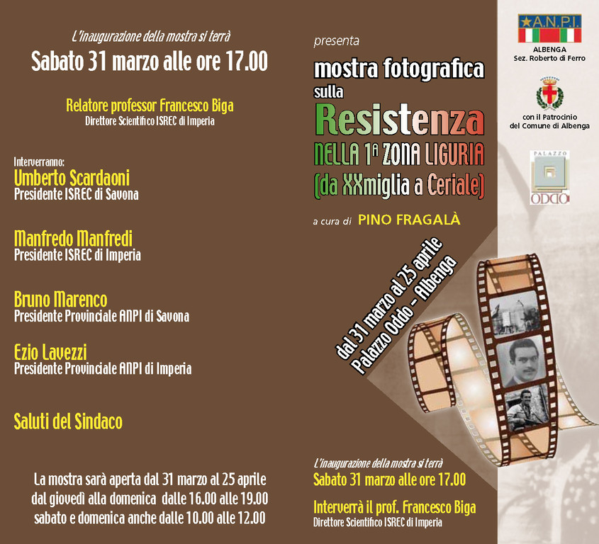 “Operazione Memoria” per l'ANPI di Albenga. In occasione della Mostra Fotografica sulla Resistenza nella 1a Zona Liguria (da Ventimiglia a Ceriale), curata da Pino Fragalà, il Direttivo della Sezione “Roberto Di Ferro” dell'ANPI lancia un appello ai parenti dei caduti nella lotta di Resistenza e dei Partigiani affinché partecipino all'inaugurazione dell'evento, che si terrà Sabato 31 Marzo alle ore 17.00 a Palazzo Oddo. L'esposizione, organizzata dall'ANPI con la collaborazione e il patrocinio della Palazzo Oddo Srl/Fondazione Gian Maria Oddi e del Comune di Albenga, resterà visitabile fino al 25 Aprile, dal Giovedì alla Domenica dalle ore 16.00 alle ore 19.00 (il Sabato e la Domenica anche dalle ore 10.00 alle ore 12.00) e con apertura straordinaria per le scuole che ne fanno richiesta.