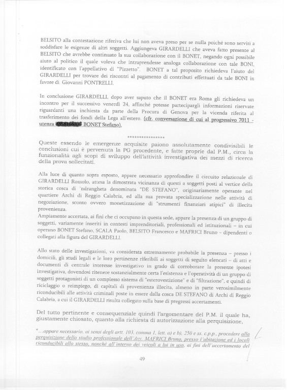 Pubblichiamo il "decreto di autorizzazione alla perquisizione ed ispezione locali oltre che a sequestro presso difensore" emesso dal GIP di Reggio Calabria Francesco Petrone nei confronti dell'indagato Francesco Belsito (LN) ed altri, che include numerose intercettazioni telefoniche