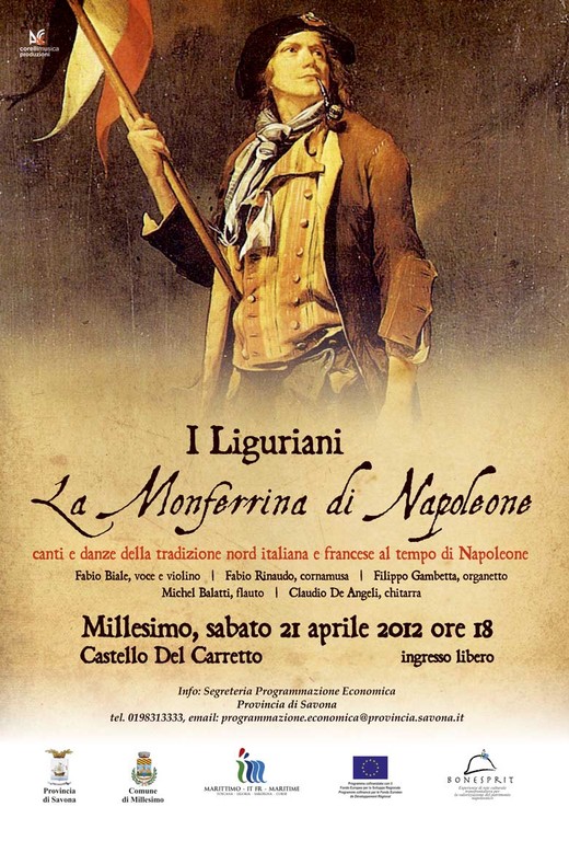 Alle ore 18.00 presso il Castello Del Carretto la formazione de I Liguriani presenterà in prima nazionale lo spettacolo dal titolo “La Monferrina di Napoleone”. Al termine del concerto verrà servito un aperitivo per tutti i presenti.