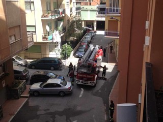 Spettacolare intervento dei Vigilil del Fuoco nel primo pomeriggio ad Albissola Marina per la rimozione di un cordolo di marmo pericolante in fregio a una facciata di un palazzo in Via dei Ceramisti.