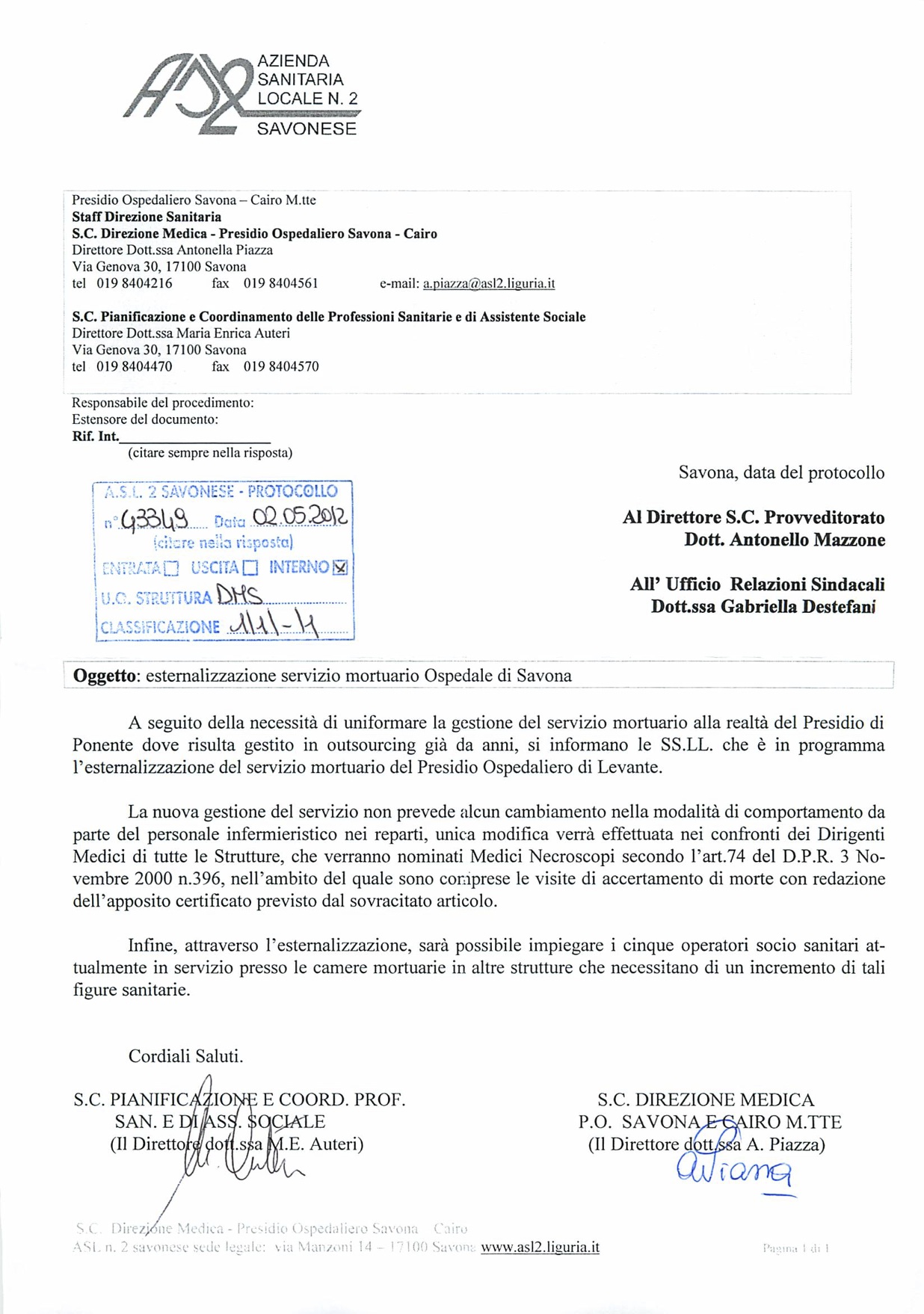 "Oggetto: esternalizzazione servizio mortuario Ospedale di Savona