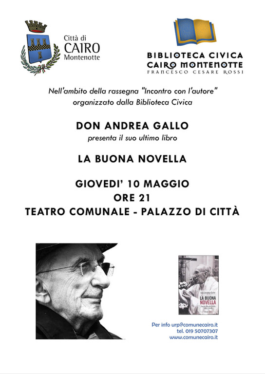 Don Gallo sarà a Cairo su iniziativa della Biblioteca Civica comunale per presentare il suo nuovo libro, parlare della crisi dei nostri tempi ma anche di speranza e determinazione, di solidarietà e buona volontà, di giovani, giustizia sociale ed equità: insomma, un appuntamento imperdibile.