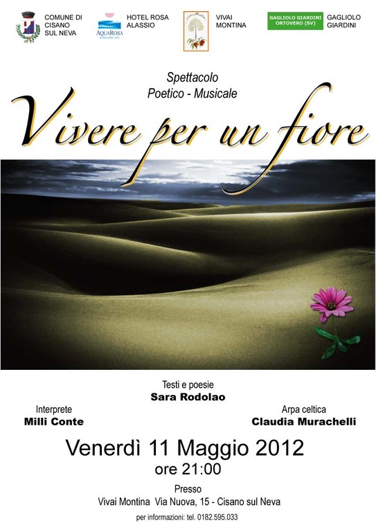 Venerdi 11 maggio alle 21,00, nella suggestiva cornice dei Vivai Montina di Cisano sul Neva, col patrocinio del Comune di Cisano, del Centro Benessere dell'Hotel Rosa di Alassio, dei Vivai Montina e dei Gagliolo Giardini di Ortovero; verrà presentato al pubblico" VIVERE PER UN FIORE", il nuovo spettacolo poetico-musicale della poetessa e scrittrice Sara Rodolao, monologo per voce femminile interpretato dall'attrice Milli Conte: “assolo autobiografico intenso, coinvolgente, altamente lirico, tratto dal libro di racconti " Donne nel Parco".Un percorso sofferto alla ricerca di sé e di un Fiore Simbolico da cui trarre forza e dare un senso alla propria vita, attraverso un tunnel bruciato di solitudine e di speranze, fino all’incontro salvifico con la Poesia che, passando una semplice carezza sui suoi capelli, trasformerà il corpo della protagonista in Luce".