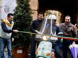 Roberto Lafornara, in arte Lafoz, l’estroso artista albenganese sta ormai portando a termine la sua operazione: il gemellaggio tra Albenga, città della fionda, e Matera, città dei … sassi. Partito sotto una pioggia battente la mattina di sabato 5 Maggio a bordo della sua Vespa 125 dalla celebre cantina dei Fieui di caruggi in vico del Collegio, circondato da tantissimi amici accorsi a salutarlo, è ormai in vista della Basilicata. Il viaggio è stato avventuroso, tormentato dal maltempo e da qualche problema alla centralina della Vespa.