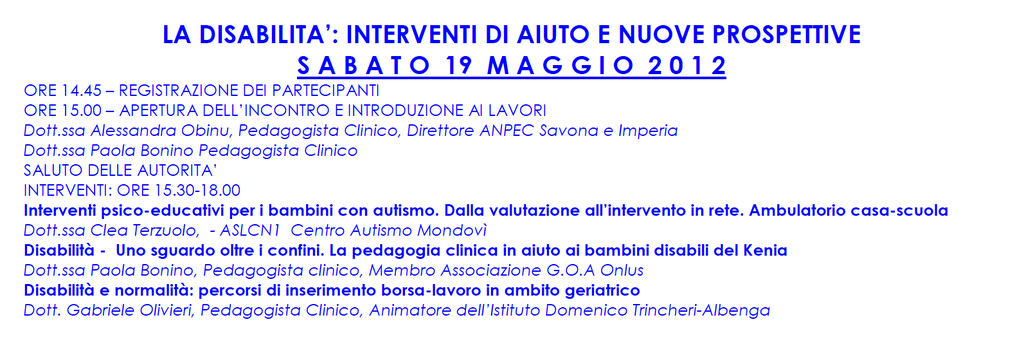 La Sezione di Savona e Imperia dell'ANPEC - Associazione Nazionale Pedagogisti Clinici, costituita nel 1997 e membro della Consulta Nuove Professioni del CNEL, in collaborazione con l’ISFAR - Formazione Post-Universitaria delle Professioni, Ente accreditato dal MIUR, Ministero dell'Istruzione, dell'Università e della Ricerca, D.M. 177/2000 del 27.11.2003 e provider E.C.M. Reg. 8256, ha organizzato un'incontro su:
