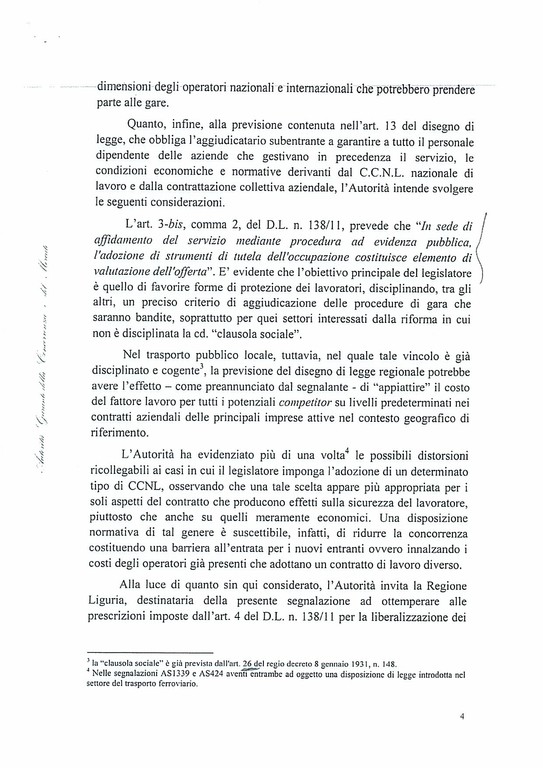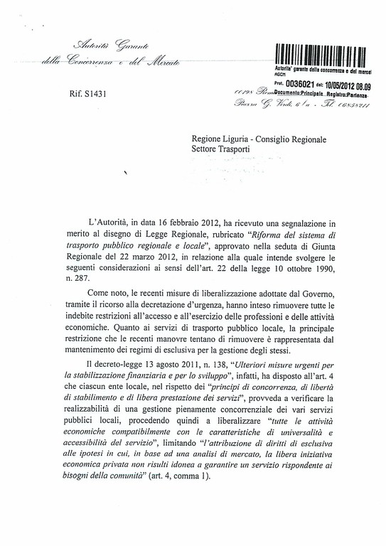 “Anche la nostra scelta – continua l’assessore ai trasporti della Regione Liguria – si basa su uno studio che abbiamo realizzato nel 2007 in cui , al contrario, si evidenziavano notevoli risparmi derivanti dall’aggregazione dei bacini”. Per quanto riguarda poi la clausola sociale, altro punto contestato dall’Anti-trust, Vesco sostiene che “l’Autorità ha fatto proprie le posizioni espresse da Riviera Trasporti che ha sempre manifestato preoccupazioni sull’unificazione aziendale e sul possibile innalzamento dei contratti di lavoro”.