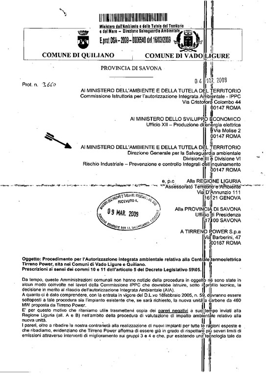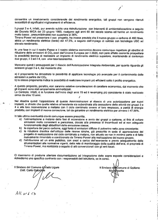 Inoltre precisiamo che i sindaci di Quiliano e Vado, Isetta e Giacobbe (quest'ultimo riteniamo ancora appartenente al suo partito) hanno chiesto precisamente la riconversione a metano dei gruppi 3 e 4 con nota ufficiale e congiunta, lasciando in subordine il rimpiazzo con impianti di nuova concezione ma sempre"a parità di energia prodotta"