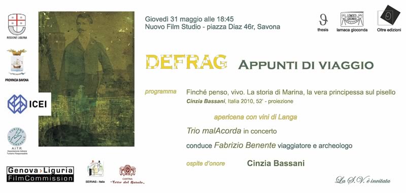 L'appuntamento è per oggi, giovedì 31 maggio, a partire dalle 18.45: DEFRAG e Nuovofilmstudio, con il patrocinio della Provincia di Savona e in collaborazione con Genova-Liguria Film Commission, presenteranno l'incontro "La salute in viaggio". Ospiti della serata Cinzia Bassani, con il documentario "Finché penso, vivo. La storia di Marina, la vera principessa sul pisello", Fabrizio Benente, guida e voce narrante dell'appuntamento, e il trio MalAcorda, che chiuderà la serata con un concerto originale e di atmosfera.