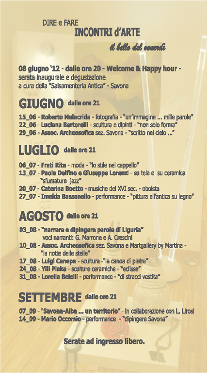 Tanti gli ospiti, tutti o quasi del territorio savonese; una superba rappresentanza del mondo artistico del territorio. Scaletta è ampia e accontenta il gusto di tanti.