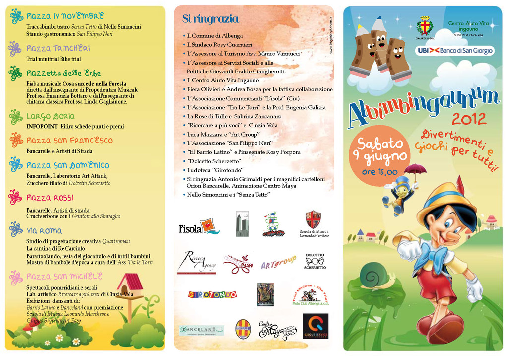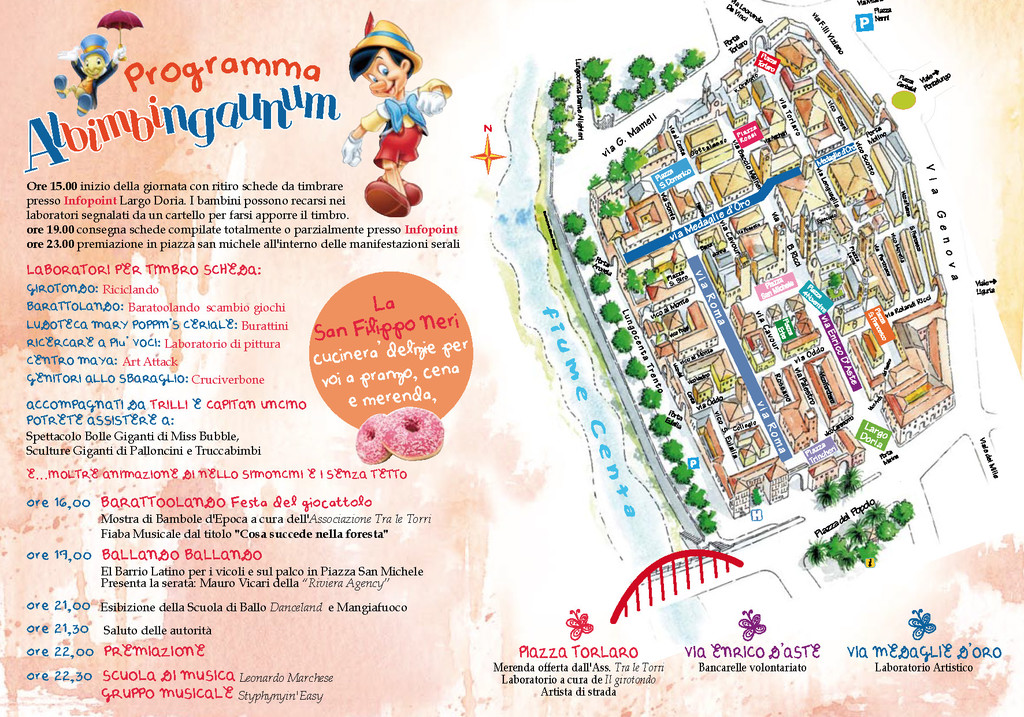 Tutto pronto per Albimbingaunum 2012. Ritorna la Nottina Bianca di Albenga dedicata ai bambini di tutte le età, con divertimenti e giochi sotto le Torri, organizzata dal Centro Aiuto Vita Ingauno con la collaborazione ed il patrocinio del Comune di Albenga. Manifestazione al via alle ore 15.00 di Sabato 9 Giugno, con il ritiro delle schede da timbrare all'Infopoint di Largo Doria (da riconsegnare compilate alle ore 19.00, con successiva premiazione alle ore 23.00). I bambini potranno recarsi nei laboratori segnalati da un apposito cartello per farsi apporre il timbro: Girotondo (Riciclando); Barattolando (Barattolando scambio giochi); Ludoteca Mary Poppins Ceriale (Burattini); Ricercare a Più Voci (Laboratorio di Pittura); Centro Maya (Art Attack); Genitori allo Sbaraglio (Cruciverbone). Accompagnati da Trilli e Capitan Uncino, i bambini potranno assistere allo spettacolo di bolle giganti di Miss Bubble ed alle Sculture Giganti di Palloncini e Truccabimbi, oltre alle animazioni di Nello Simoncini ed i Senzatetto.