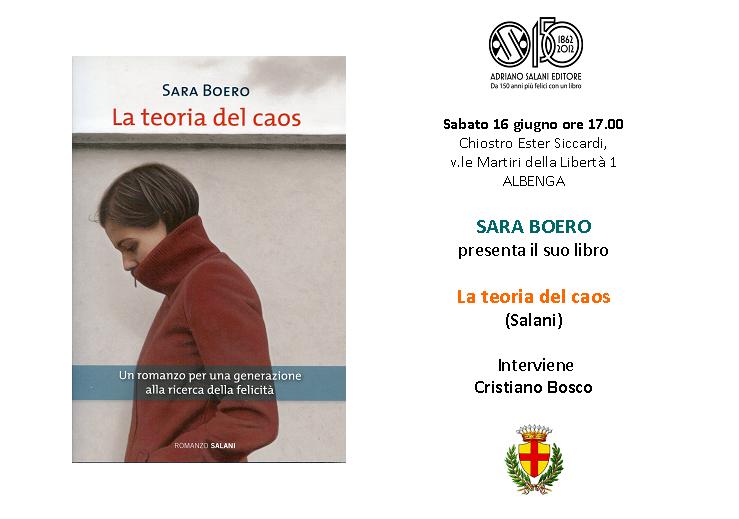 Il chiostro “Ester Siccardi” in Viale Martiri della Libertà ritorna ad ospitare gli appuntamenti letterari. Sabato 16 Giugno alle ore 17.00, lo spazio comunale all’aperto sarà teatro della presentazione del libro “La Teoria del Caos” (2011, Salani Editore), romanzo d’esordio della giovane scrittrice genovese Sara Boero. A presentare il libro, oltre all’autrice, sarà Cristiano Bosco, giornalista ed addetto stampa del Comune di Albenga. L’iniziativa, che gode del patrocinio e della collaborazione del Comune di Albenga, sarà realizzata con la partecipazione della Libreria “San Michele” di Albenga e dell’Ufficio Stampa di Salani Editore.
