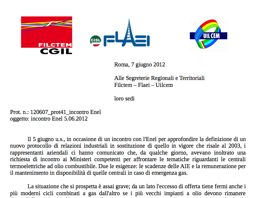 Il 5 giugno u.s., in occasione di un incontro con l'Enel per approfondire la definizione di un nuovo protocollo di relazioni industriali in sostituzione di quello in vigore che risale al 2003, i rappresentanti aziendali ci hanno comunicato che, da qualche giorno, avevano inoltrato una richiesta di incontro ai Ministeri competenti per affrontare le tematiche riguardanti le centrali termoelettriche ad olio combustibile. Due le esigenze: le scadenze delle AIE e la remunerazione per il mantenimento in disponibilità di quelle centrali in caso di emergenza gas.