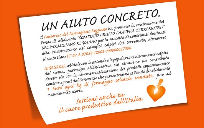 Sostenendo il “Comitato Gruppo Caseifici Terremotati” del Parmigiano Reggiano, Sogegross commercializza i prodotti appositamente contrassegnati dal consorzio stesso che garantiranno al Fondo di solidarietà per le aziende devastate dal sisma 1 euro ogni kg di formaggio solidale venduto, fino ad esaurimento scorte.