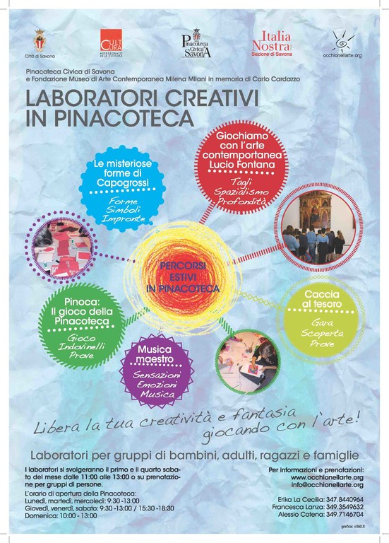 Per quest’estate sarà possibile liberare la propria creatività e fantasia giocando con l’arte attraverso diversi laboratori. Pinoca: il gioco della Pinacoteca, in cui le sale del museo diventano le caselle di un originale gioco dell’oca; Musica Maestro, imparare a “disegnare” la musica con forme e colori secondo le teorie di Kandinskij; Caccia al tesoro, seguire indizi e prove per scoprire il “tesoro” dalle opere del museo; Giochiamo con l’arte contemporanea, Lucio Fontana, scoprire e utilizzare i famosi “tagli” e “buchi” dell’artista e Le misteriose forme di Capogrossi dove imparare a usare forme astratte per creare un grande mosaico di gruppo. Per maggiori informazioni o per prenotazione di gruppi è possibile visitare il sito www.occhionellarte.org o scrivere a info@occhionellarte.org oppure www.comune.savona.it