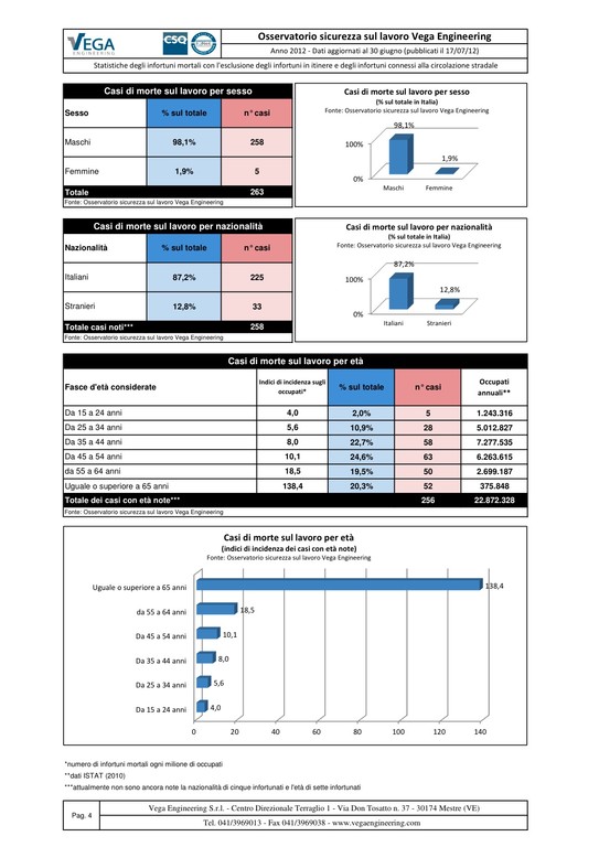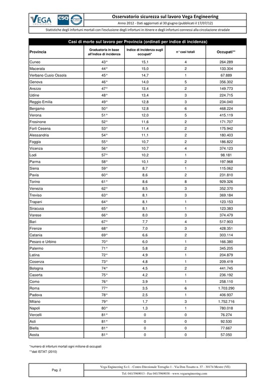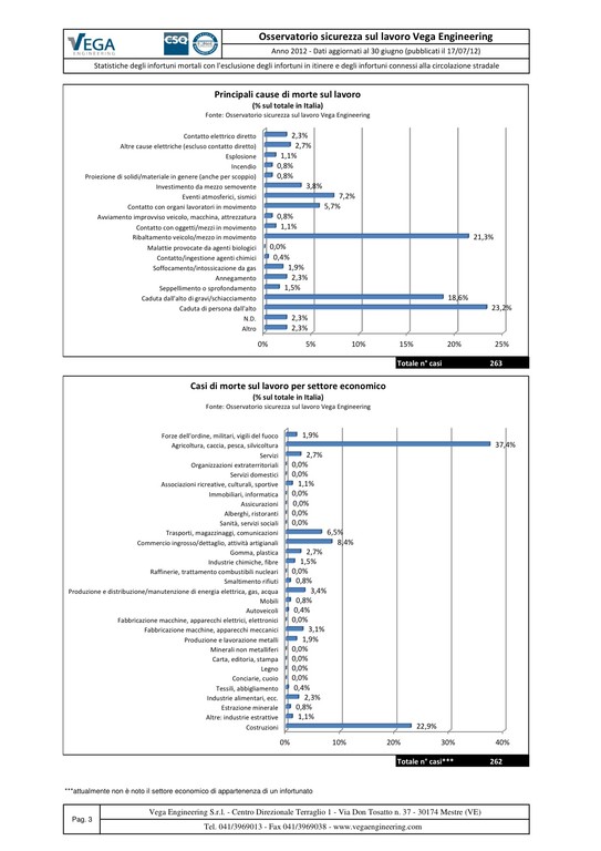 Pubblichiamo quindi i dati sulle morti bianche reperiti da Vega Engeneering, società di Ingegneria che offre servizi per le aziende, negli ambiti della salute e sicurezza nel lavoro.
