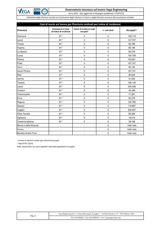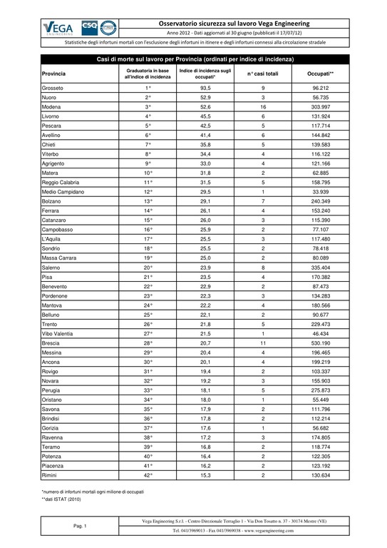 Sul fronte provinciale è Modena a far registrare il maggior numero di vittime sul lavoro con 16 decessi nel primo semestre. Seconda è Brescia (11 morti – 2 in più rispetto a fine maggio), terza Grosseto (9). Le dieci province in cui l’Osservatorio Vega Engineering rileva il più alto rischio di mortalità sono: Grosseto, con un indice di incidenza sulla popolazione lavorativa di 93,5, seguita da Nuoro, Modena, Livorno, Pescara, Avellino, Chieti, Viterbo, Agrigento e Matera.