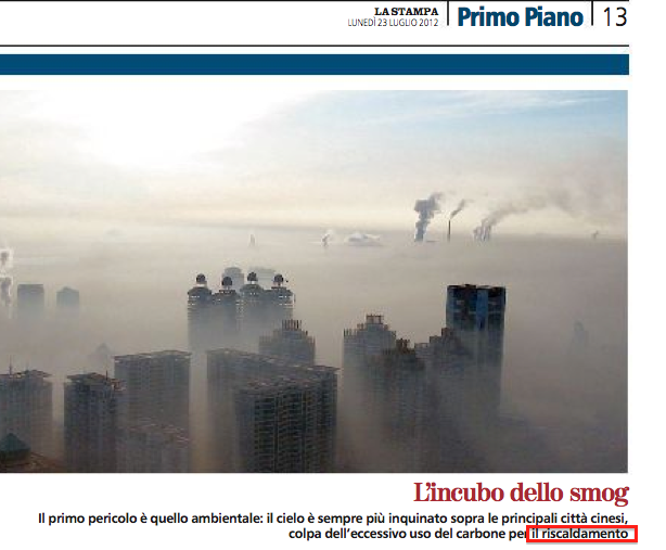 Non si può (s)fiatare invece - sui giornali seri - delle migliaia di MegaWatt elettrici prodotti in Cina con il sistema più semplice, meno oneroso e più tossico: il vecchio, sano carbone bruciato a milioni di tonnellate nelle centrali cinesi, altro che riscaldamento.