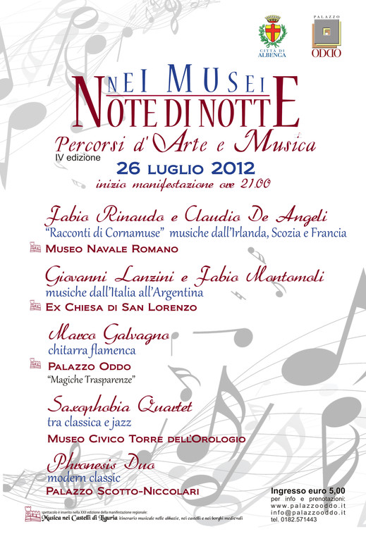 “Sono molto lieto di questa nostra prima collaborazione con la Fondazione Gian Maria Oddi”, aggiunge Fabio Rinaudo, artista e responsabile del “gemellaggio” tra la manifestazione ed il circuito “Musica nei Castelli di Liguria”. “Albenga è una città meravigliosa, e sarà molto gratificante poter offrire a tutti, nel corso della serata, proposte musicali in grado di soddisfare ogni tipo di pubblico”.