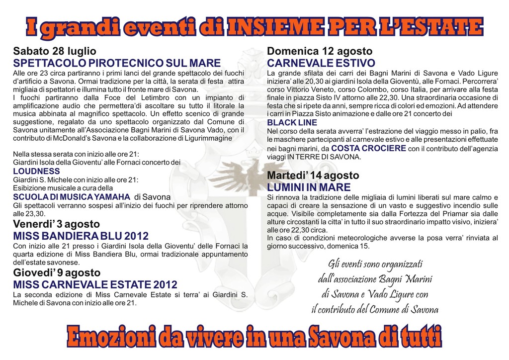 Prende il via Sabato 28 Luglio il programma di iniziative promosse dall'Associazione Bagni Marini Savona e Vado Ligure in collaborazione con il Comune di Savona ed il contributo, in qualità di sponsor, di McDonald's Savona.