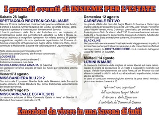 Prende il via Sabato 28 Luglio il programma di iniziative promosse dall'Associazione Bagni Marini Savona e Vado Ligure in collaborazione con il Comune di Savona ed il contributo, in qualità di sponsor, di McDonald's Savona.