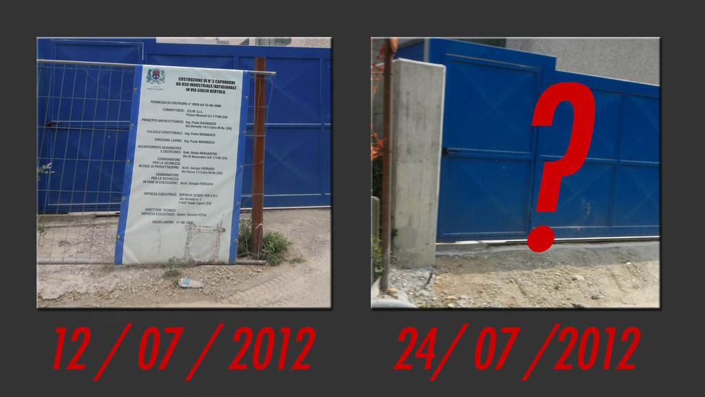 Stessa via di Scavo Ter, in un capannone semideserto costruito da Scavo Ter, con tanto di cartello di appalto fronte ingresso a certificarlo.