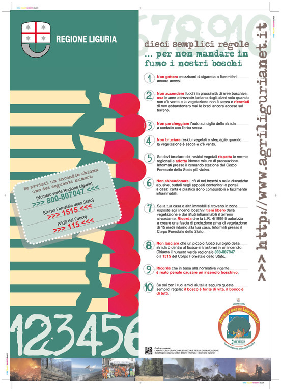 La Regione Liguria, che ai sensi della legge 353/2000 “Legge quadro in materia di incendi boschivi”, ha specifiche competenze nell’ambito della pianificazione delle attività di prevenzione e lotta attiva contro gli incendi boschivi, ha predisposto un decalogo che deve essere osservato da tutti i cittadini che hanno un contatto con il bosco.