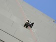 Un alpinista si cala dalla torre vetrometallica della darsena con un grosso bidone della rumenta