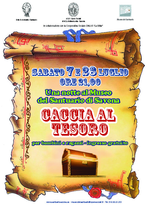 L’Azienda Opere Sociali di N.S. di Misericordia di Savona in collaborazione con l’Ente Ecclesiastico Santuario organizza alle ore 21.00 del 7 e del 28 LUGLIO 2012 una caccia al tesoro al Museo del Santuario: un'occasione per divertirsi tutti insieme e per scoprire i preziosi tesori donati nel corso dei secoli in segno di devozione alla Vergine.