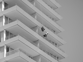 Un alpinista si cala dalla torre vetrometallica della darsena con un grosso bidone della rumenta