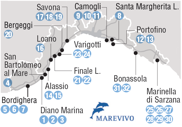 Ancora una volta la Liguria partecipa attivamente alla campagna. Saranno infatti 32 gli stabilimenti balneari coinvolti, in particolare nelle località di Bordighera, Diano Marina, San Bartolomeo al Mare, Alassio, Loano, Finale Ligure, Varigotti, Bergeggi, Savona, Camogli, Portofino, Santa Margherita Ligure, Bonassola, Marinella di Sarzana.