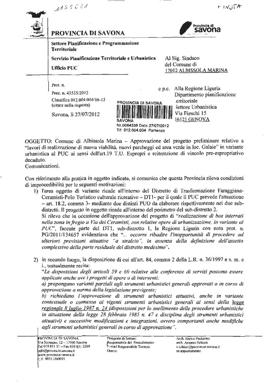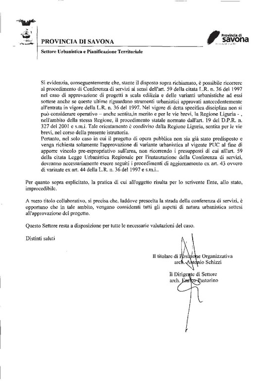 La Provincia di Savona, che è l'ente sovraordinato preposto per legge a dare l'autorizzazione a procedere per tutte le questioni attinenti l'urbanistica, ha bocciato in toto il progetto senza neanche avere bisogno di entrare nel merito dei suoi contenuti progettuali. Il comune deve rispettare, come tutti i cittadini, le regole che sono contenute nel suo stesso piano urbanistico.