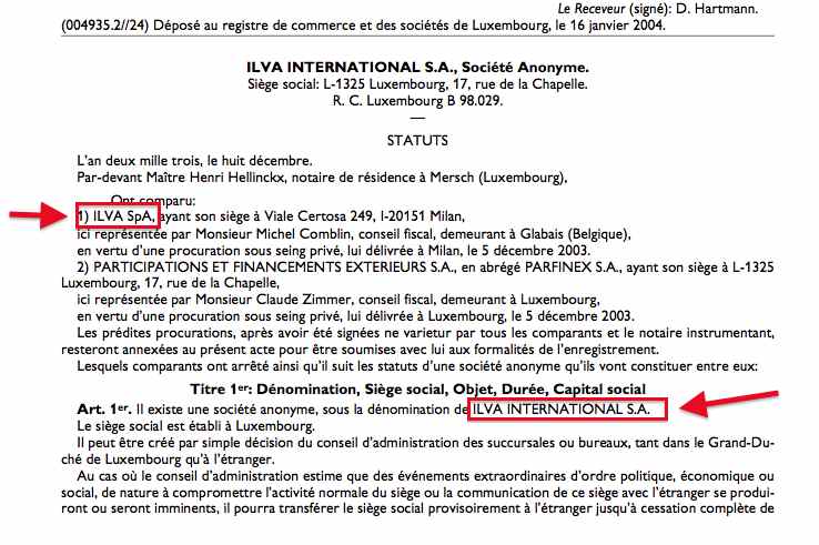 ILVA INTERNATIONAL S.A. costituita il 05/02/2004, in rue de la chapelle (la strada della cappella) pure al civico 17