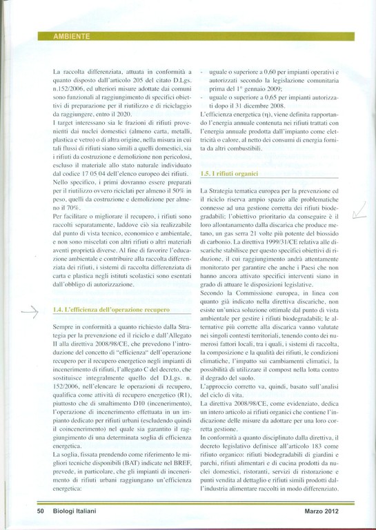 La Direttiva 2008/98/CE recepita con il Decreto legislativo 3 dicembre 2010 n. 205 "Disposizioni di attuazione della direttiva 2008/98/CE del Parlamento europeo e del Consiglio del 19 Novembre 2008 relativa ai rifiuti e che abroga alcune direttive" riordina il quadro normativo nazionale in materia di rifiuti e riguardo all’ "efficienza per il recupero energetico" dei rifiuti (allegato C del decreto) "qualifica come attività di recupero energetico (R1)…, l’operazione di incenerimento effettuata in un impianto dedicato per i rifiuti urbani (escludendo quindi il coincenerimento) nel quale sia garantito il raggiungimento di una determinata soglia di efficienza energetica" . (allegato pag 50 "Biologi Italiani" n.3 marzo 2012 R. Laraia "Il quadro normativo nazionale in materia di rifiuti")