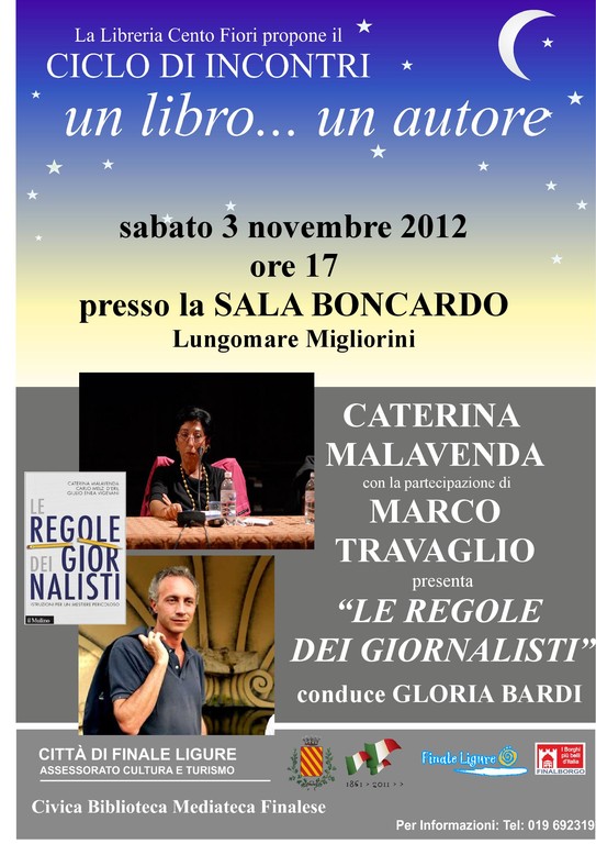 Proseguono a Finale Ligure gli appuntamenti del ciclo "Un libro... un autore" organizzati dalla Libreria Cento Fiori con il patrocinio dell'Assessorato al Turismo e alla Cultura del Comune. Sabato 3 novembre alle ore 17, presso la Sala Boncardo (Lungomare Migliorini), Caterina Malavenda presenterà il suo libro "Le regole dei giornalisti. Istruzioni per un mestiere pericoloso". Parteciperà Marco Travaglio. A condurre l'incontro sarà Gloria Bardi.