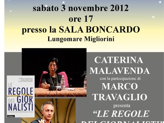 Proseguono a Finale Ligure gli appuntamenti del ciclo "Un libro... un autore" organizzati dalla Libreria Cento Fiori con il patrocinio dell'Assessorato al Turismo e alla Cultura del Comune. Sabato 3 novembre alle ore 17, presso la Sala Boncardo (Lungomare Migliorini), Caterina Malavenda presenterà il suo libro "Le regole dei giornalisti. Istruzioni per un mestiere pericoloso". Parteciperà Marco Travaglio. A condurre l'incontro sarà Gloria Bardi.