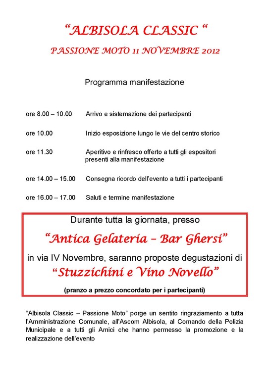 Visto il successo della prima Rassegna – Esposizione Motociclistica svoltasi a novembre dello scorso anno, l’incallito e sempre più determinato gruppo di “Albisola Classic” appassionati di tutto ciò che riguarda i motori, con la fattiva collaborazione dell’Amministrazione Comunale e dell’Ascom di Albisola, ha raccolto la sfida e domenica 11 novembre darà vita, nelle vie del centro storico di Albisola Capo, alla 2^ Rassegna – Esposizione Motociclistica dedicata interamente alle due ruote nelle categorie “Epoca – Classiche – Special”.